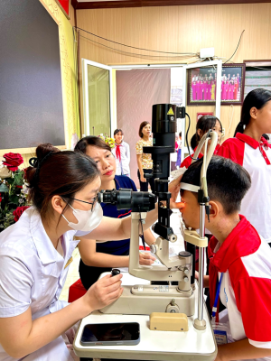 Ngay sau phần phát biểu và tư vấn chuyên môn, các bác sĩ, điều dưỡng của Bệnh viện Mắt Thái Bình đã tiến hành khám sàng lọc cho hơn 500 học sinh toàn trường. Các em được đo thị lực, kiểm tra khúc xạ, soi đáy mắt và tư vấn điều trị cụ thể đối với những trường hợp có biểu hiện bất thường.